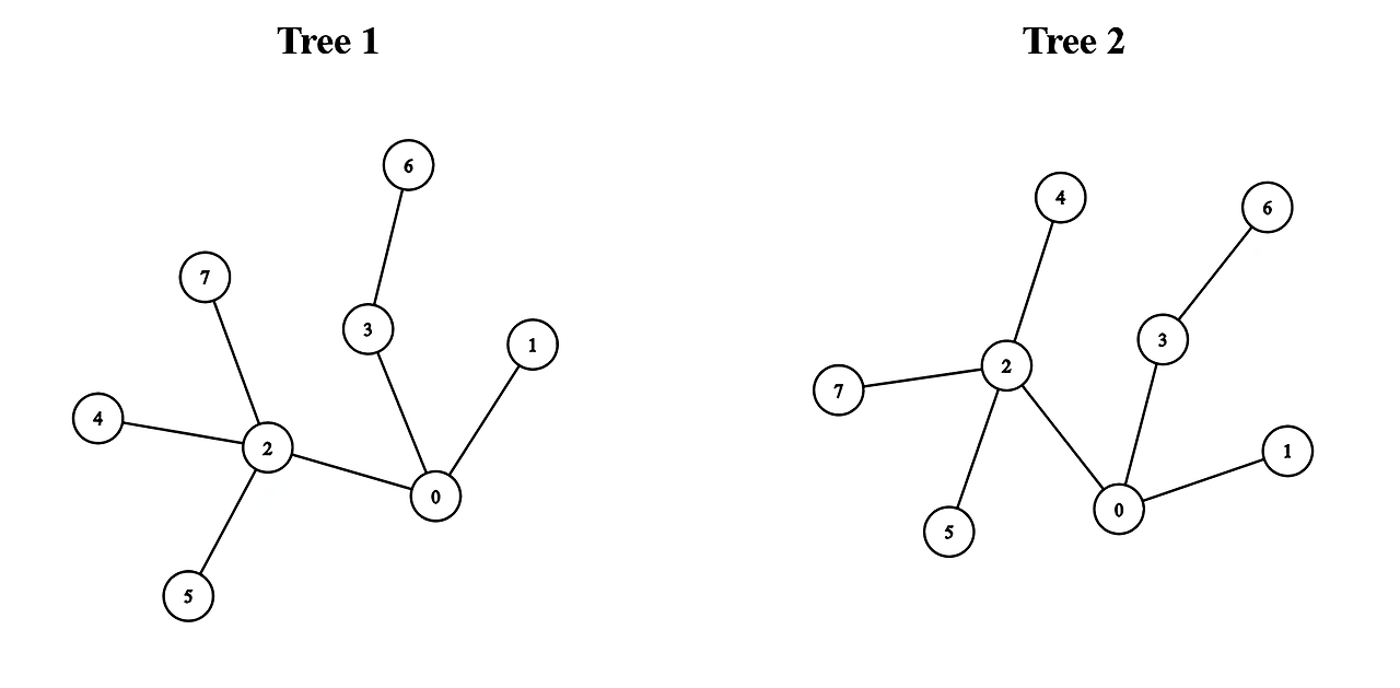 Input: edges1 = [[0,1],[0,2],[0,3],[2,4],[2,5],[3,6],[2,7]], edges2 = [[0,1],[0,2],[0,3],[2,4],[2,5],[3,6],[2,7]]