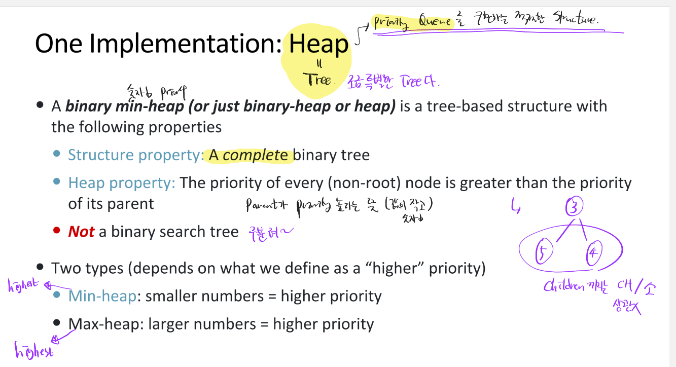 Heap은 BST가 아니라 Completed binary tree이다. parent과 children node 간의 대소비교만 유의미하고, Structure은 Left부터 차곡 차곡 쌓여있는 구조여야 한다.