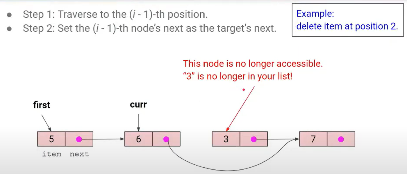 2) i-1 번째 node의 next를 target(i) 의 다음으로 바꾼다. 즉 i-1번째의 next를 i번째 node의 next로 해주면 됨