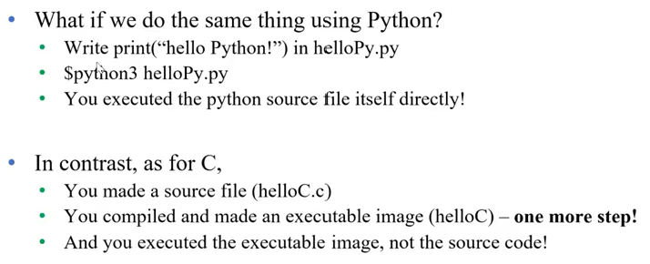 - C에선 코드 파일을 실행가능한 파일로 Compile 해주고(Image) 그 파일을 결과물로 보여주는 것