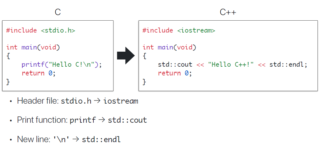 2) Header file : stdio.h --> iostream ( C++ Header file 종류 장난 없다.. 엄청 많고 다 암기 必 )