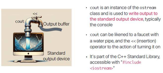 - cin 과 cout과 같은 I / O Stream은 in/output operation을 담당하고 C++ Standard Library의 일부이다.
