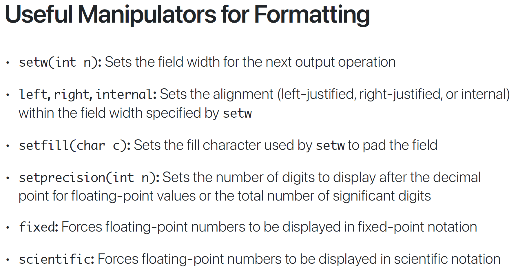 - Leading Zeros : setfill과 setw를 이용해 숫자의 길이조절 및 여백을 채워 넣을 문자or 숫자를 선정할 수 있다.