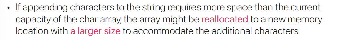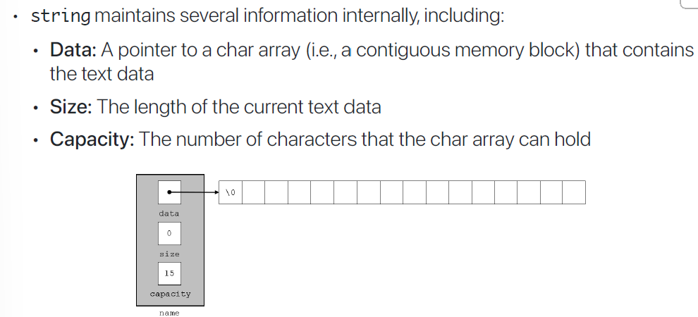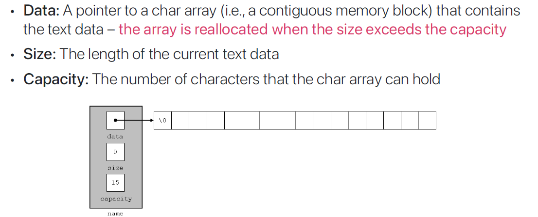 - C++ STD Library는 string class를 지원하고, 이는 순차적으로 연결된 dynamic memory를 사용하는 array의 형태이다.