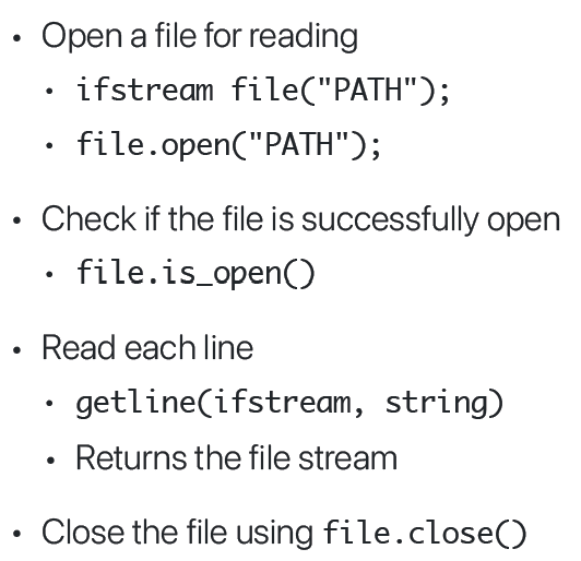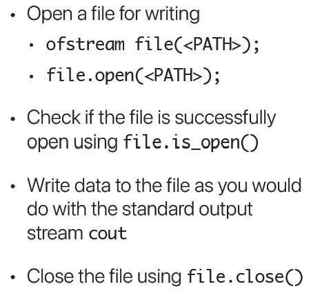 - C++에선 input file stream --> ifstream , output file stream --> ofstream class를 사용한다.