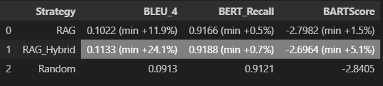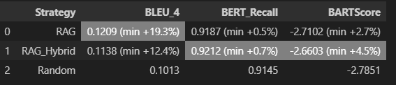 일단 지금까지는 SQL-to-NL(Natural Language) 의 Output Semantic 정확도를 측정하기 위해서 BLEU-4 / BERT Recall / BART Score을 사용했다. 이것들의 특징을 다시 한 번 Review하자면 다음과 같다.