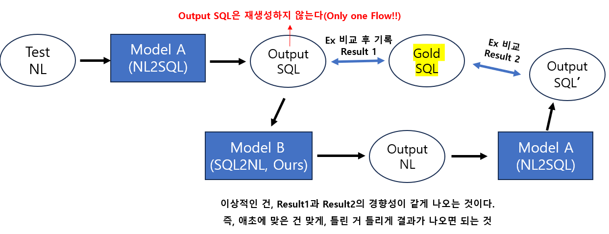근데 문제는,, 이건 Whole Framework에서 내가 그동안 ' SQL2NL Model은 무조건 정확하다고 가정하자! ' 의 영역이다. 주요 Point는 어떻게든 SQL2NL Model을 NL2SQL과 엮어야 Merit가 있는데...