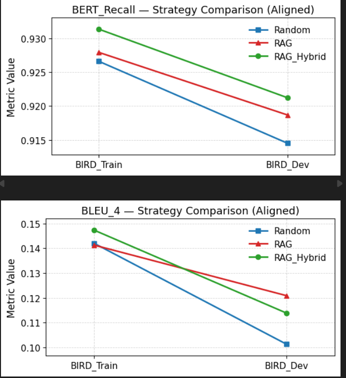 BIRD_Train, BIRD_Dev, 그리고 내가 Refine한 Dataset에서 모두 RAG_Hybrid가 가장 높고, 그다음 RAG 그 다음 Random 순인 Graph를 얻는 것.