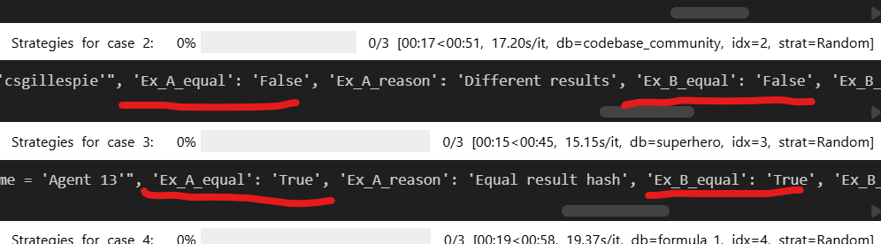 흠.. 일단 이거는 Ex_A(처음 NL2SQL), Ex_B(재생성된 NL2SQL) 값이 아래와 같이 True True / False False로 다른 Case가 있으니 일차적으로 동작은 잘 하는 거 같소만.. 뭔가 Error가 뜨는 걸로 봐서 문제가 좀 있는 거 같다.