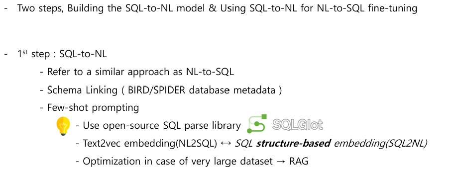 여기서 1st step은 SQL2NL을 하는데, NL2SQL Task를 그대로 이용하는 것이다. 주로 Dataset은 BIRD / Spider를 이용했고 학위논문엔 Spider 2.0을 추가하는 것을 검토해보자.