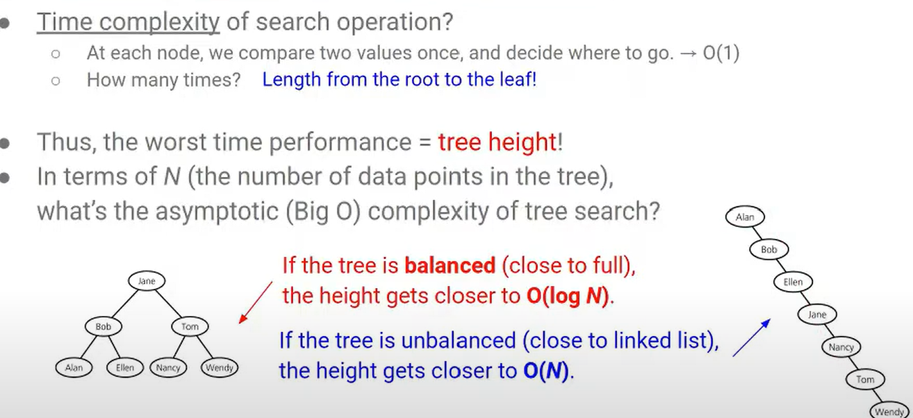 - Tree의 Height은 그 모양에 따라 다르다. Balanced 일 때는 Height --> O(log N) 이고, Unbalanced --> O(N)
