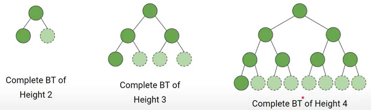 - h-1까지는 tree가 full로 차 있고, 마지막 h level (leaf 단) 에선 node가 full로 차 있어도 되고 차 있지 않아도 된다. 다만, 차 있다면 왼쪽부터 채운다. --> 뭔가 억지스러운 정의 -_-