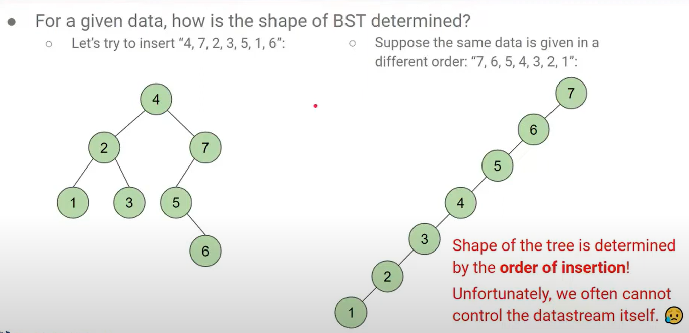 - Tree의 모양은 Data의 Insertion 순서에 따라 모양이 달라진다.