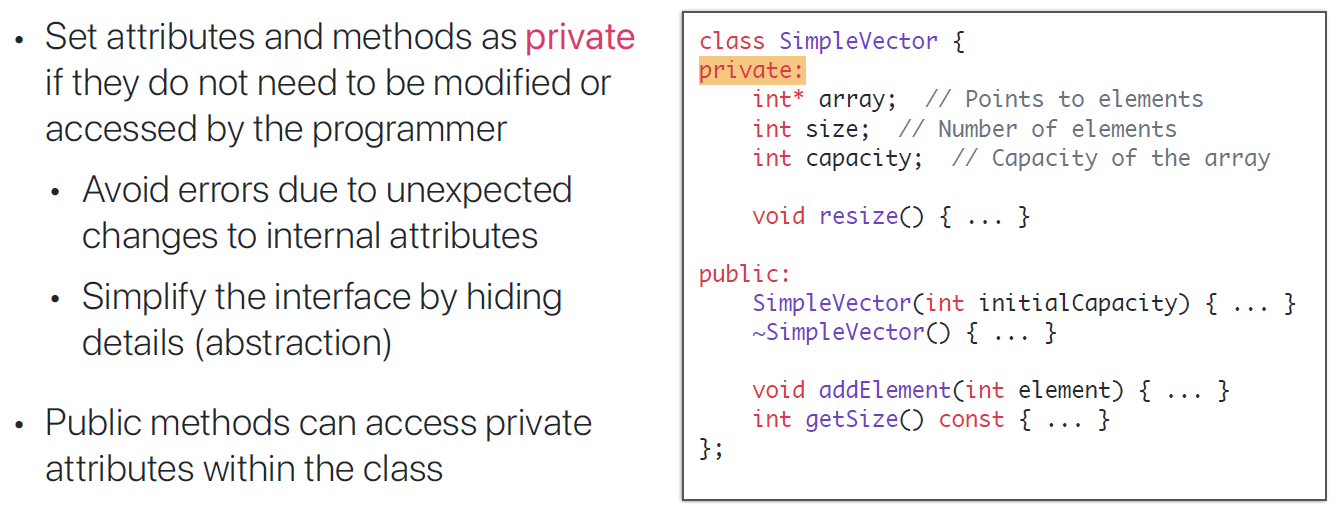 - Private 문구는 attribute / method의 의도치 않은 수정을 방지해주고, interface를 깔끔하게 해준다. for user(abstraction)