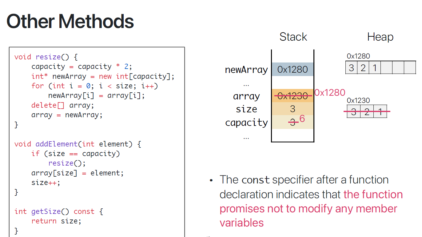- int getSize() 에서 const는 요 함수에선 variable 변화는 없다고 compiler에게 일러 주는 것 --> 코드 효율화