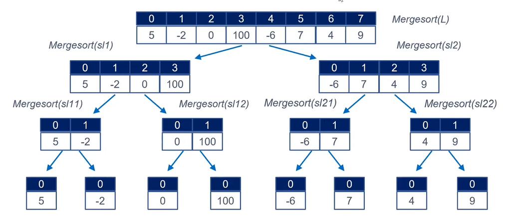 Basecase는 list의 element가 1개인 경우라, Base 될 때까지 계속 쪼갠다