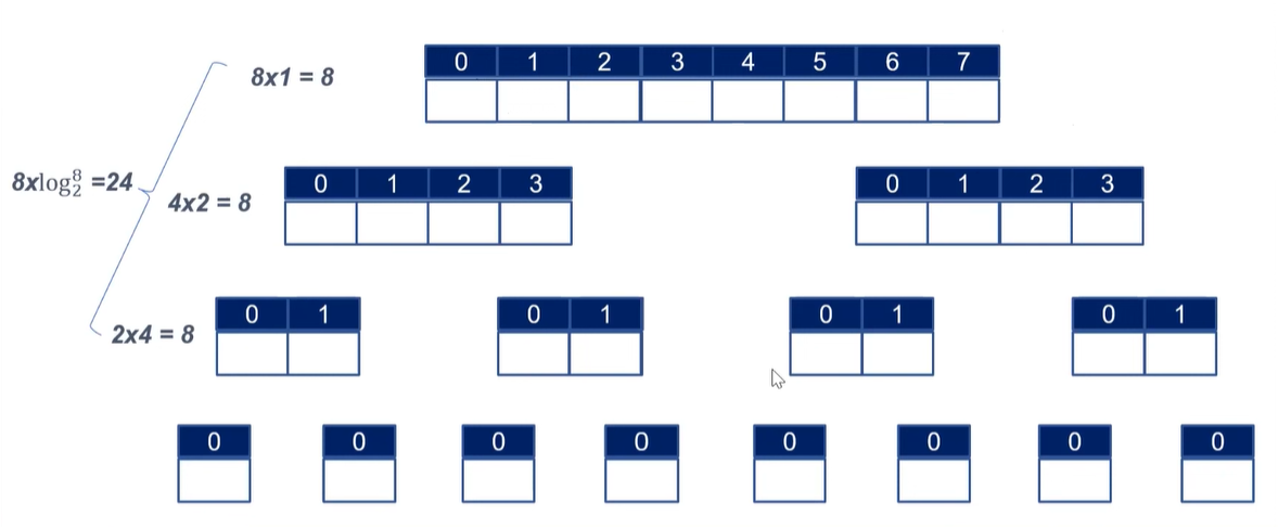 Merge 하는게 각 층마다 N만큼 Time이 발생한다. 그리고 층의 개수는 log N 이라서 결국 Time Complexity는 NlogN 으로 이득이다!