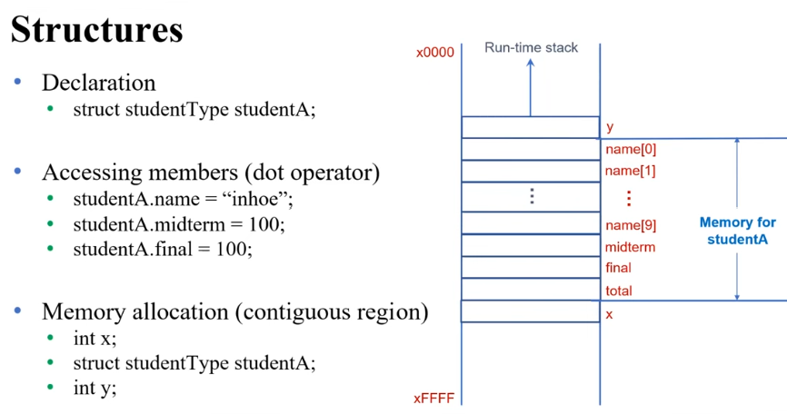 Structure의 Memory 형태를 살펴보면, 일전에 배웠던 Array처럼 Memory들이 뭉쳐서 표현되어 있다.