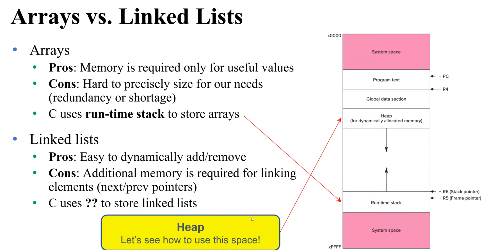 반면, Linked List 같이 늘었다 줄었다가 반복적인 친구는 Array 같은 다소 딱딱한 구조에 Memory를 할당하면 비효율적이라 Heap이라는 영역에 할당하며 이를 Dynamic Memory Allocation, 메모리 동적할당이라고 한다.