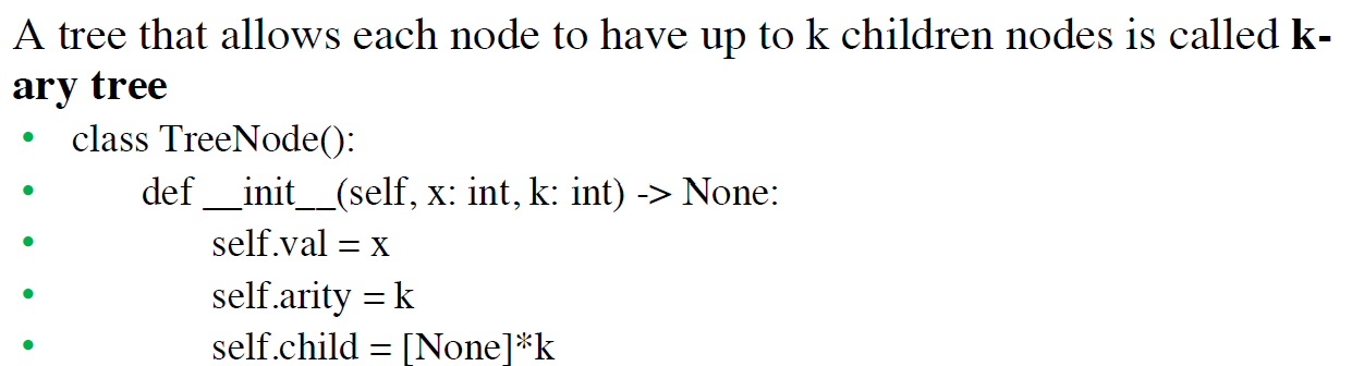 일반적인 tree는 꼭 2개의 child가 있을 건 아니다. K-ary tree -> 자식을 K개씩 가질 수 있다.