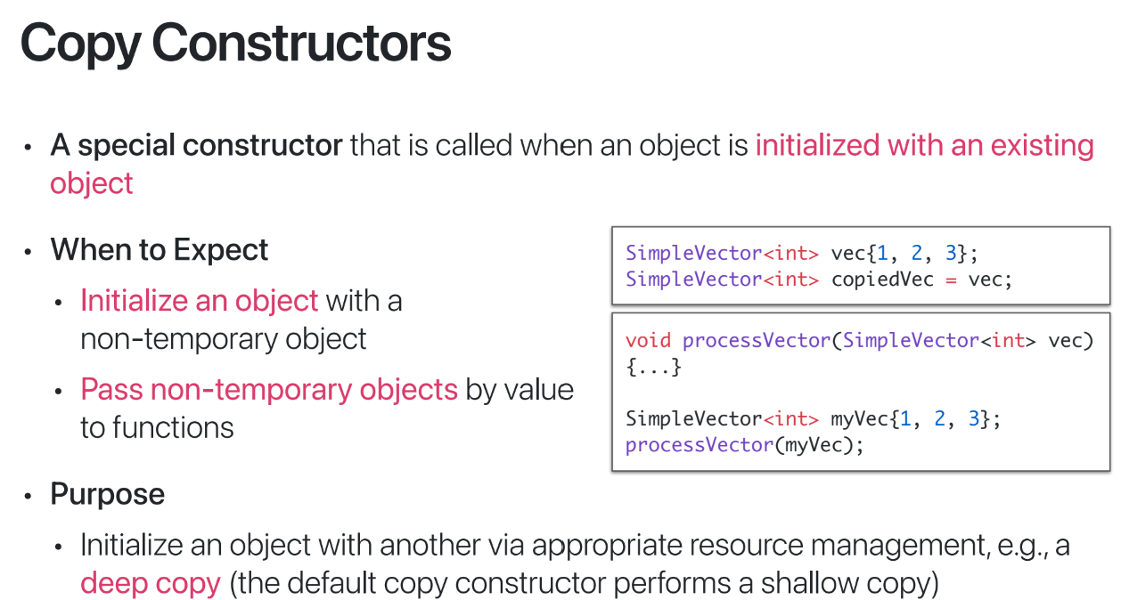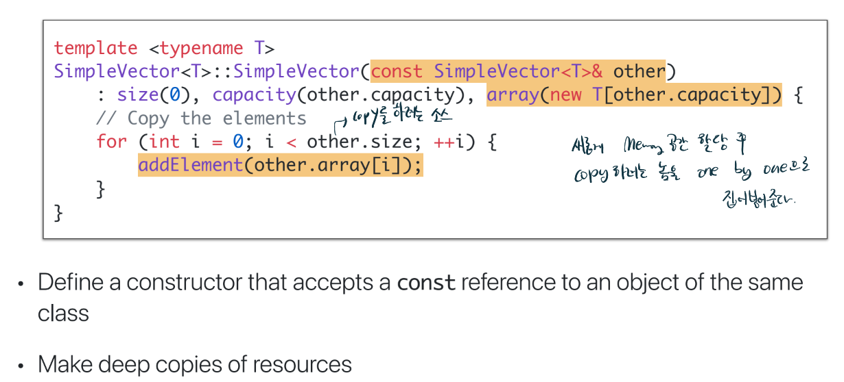 이런식으로 Constructor를 만들어 줄 때, 아예 Parameter로 특정 SimpleVector class의 object를 받게 하여 얘 값과 똑같은 New Object를 initialize하는 개념이다.