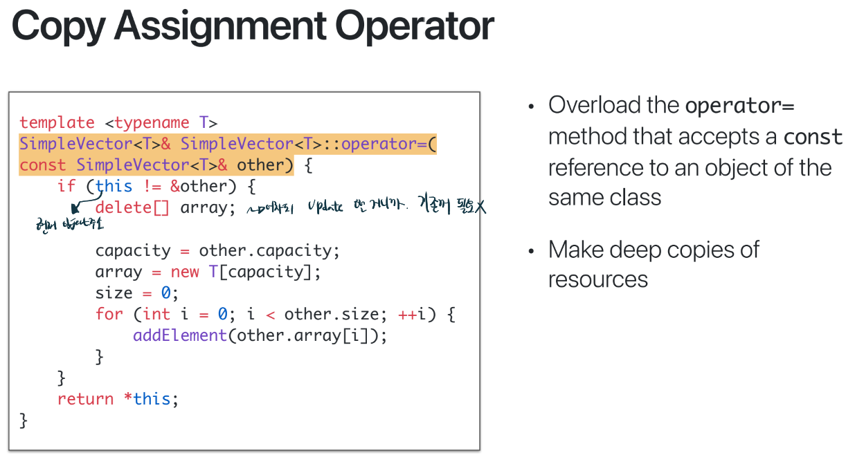 기존 array는 어차피 이제 update되면 필요가 없으니까 delete 해주고, 우측 Operand와 똑같은 놈을 만들기 위해 새로운 array를 다시 할당 해준다.