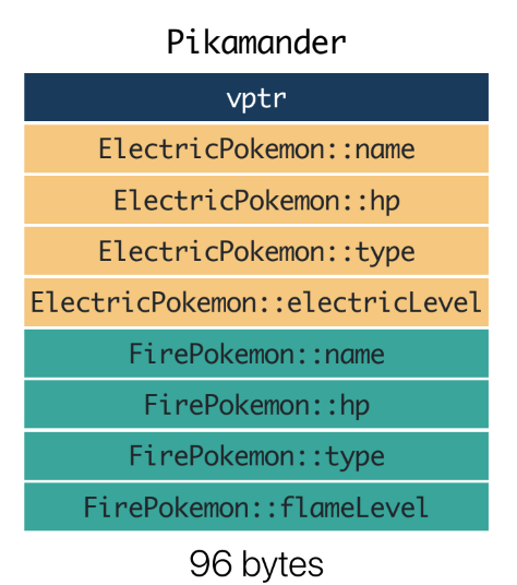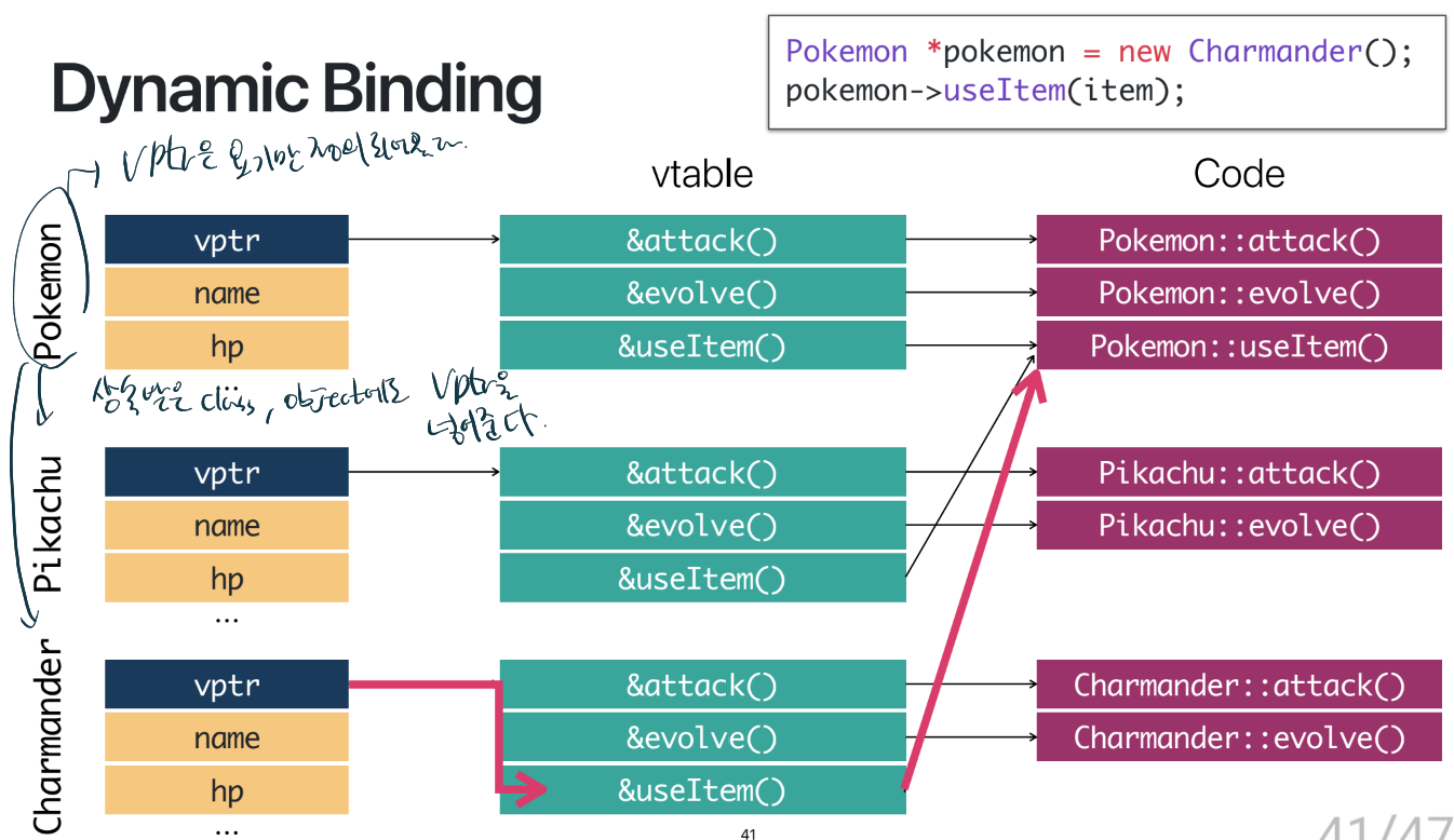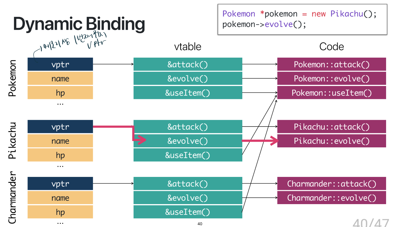 vptr은 각 class에서 메모리 가장 상단에 위치해 있으며 vtable은 각각의 class에서 Pokemon 부모 class 외에 method가 어디에 있는지 그 memory주소를 담고 있는 tablel이다.