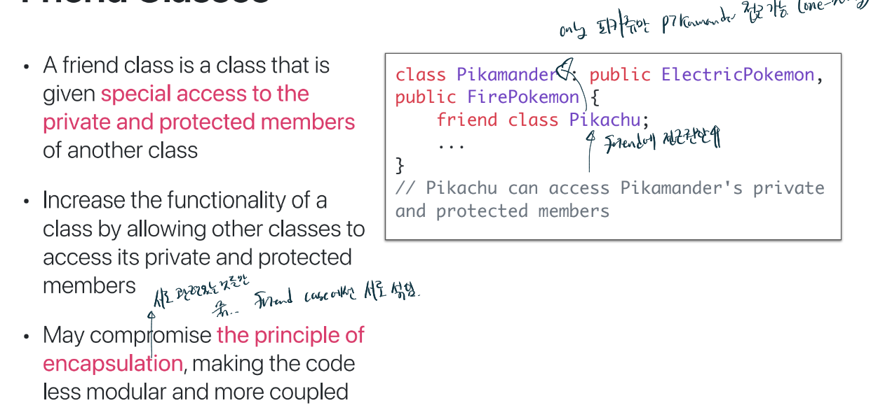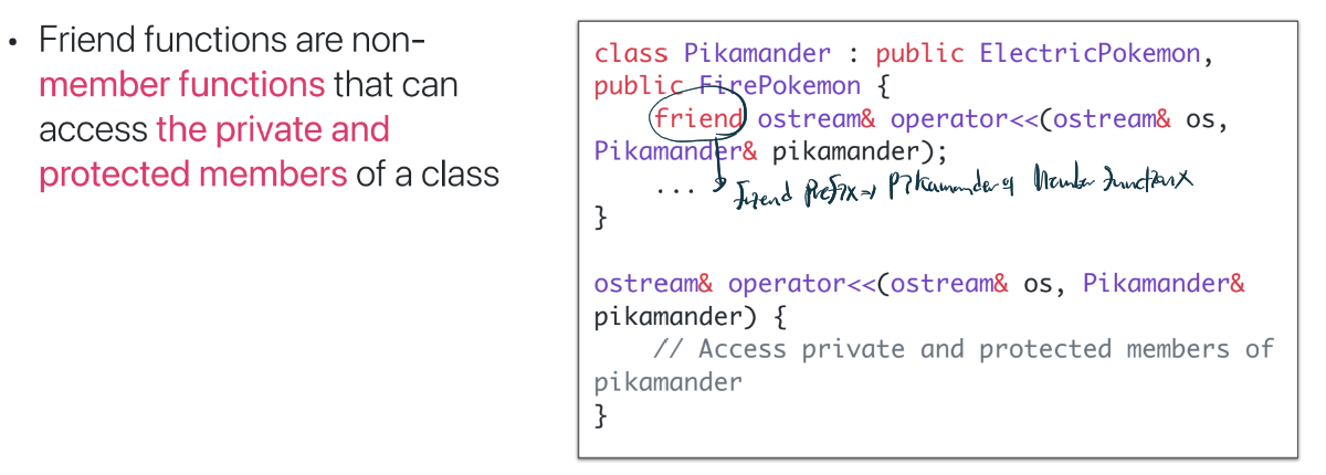 이렇게 선언하면 Pikachu class가 Pikamander class의 private/protected 영역에 접근할 수 있다. 이건 주로 Operator overloading을 구현할 때 쓴다.