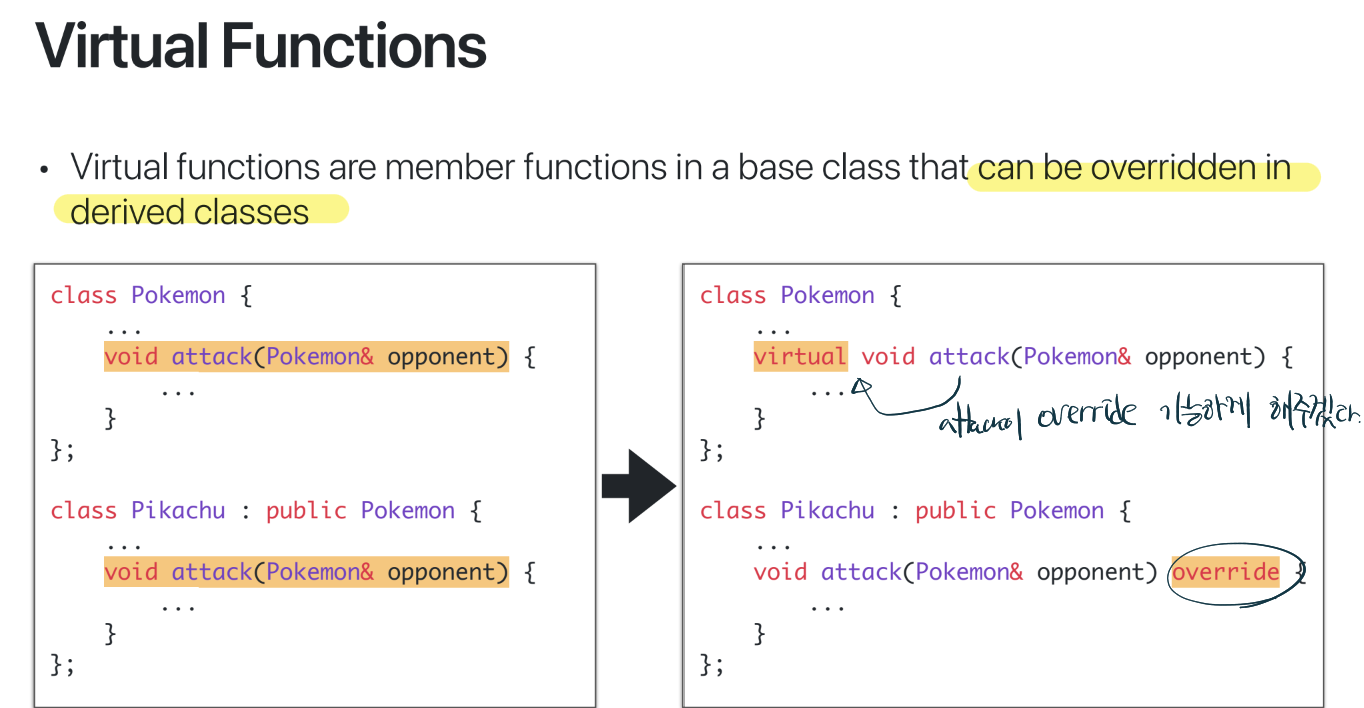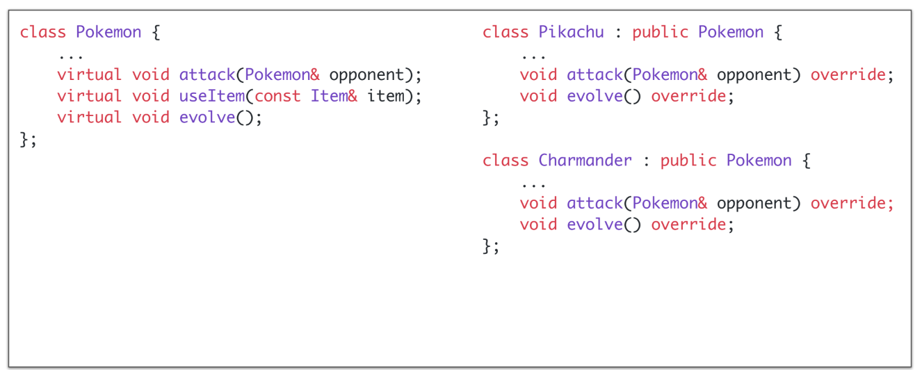 역시나, 만약에 그냥 virtual 을 썼음에도 기존 부모class의 method를 실행시키고 싶다면 Pokemon:: scope를 사용하면 된다.