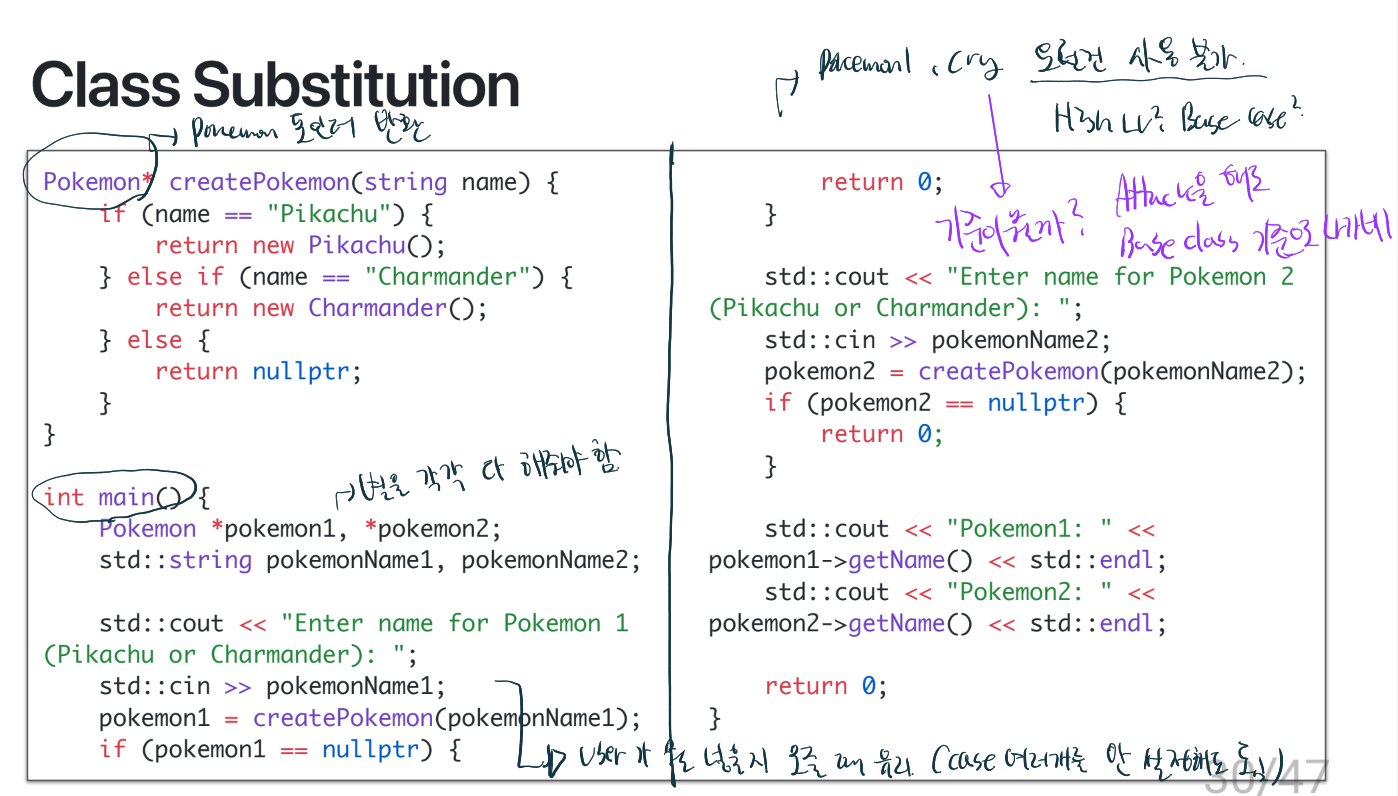 이렇게 Pokemon class를 가르키는 Pointer를 반환하는 함수를 만들면, 얘네 가지고 부모 class public member는 물론 자식 class object에도 접근할 수 있다.
