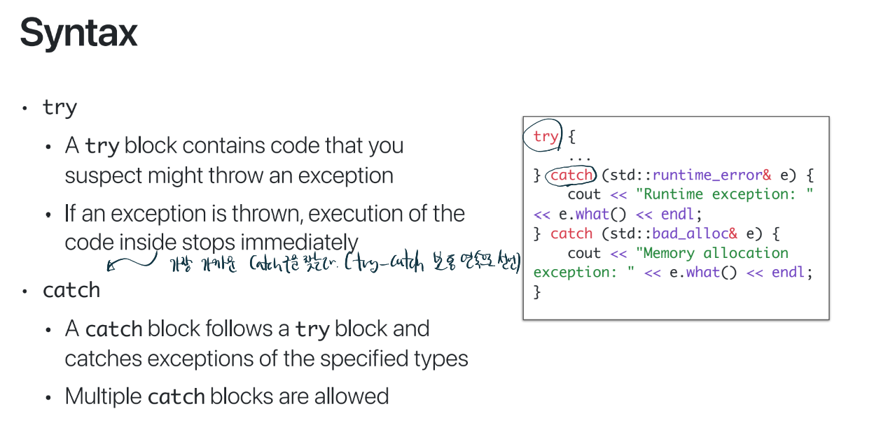예외 처리 구문은 위와 같다. try - catch 구문으로 어떤 error가 발생했는지 잡는다.