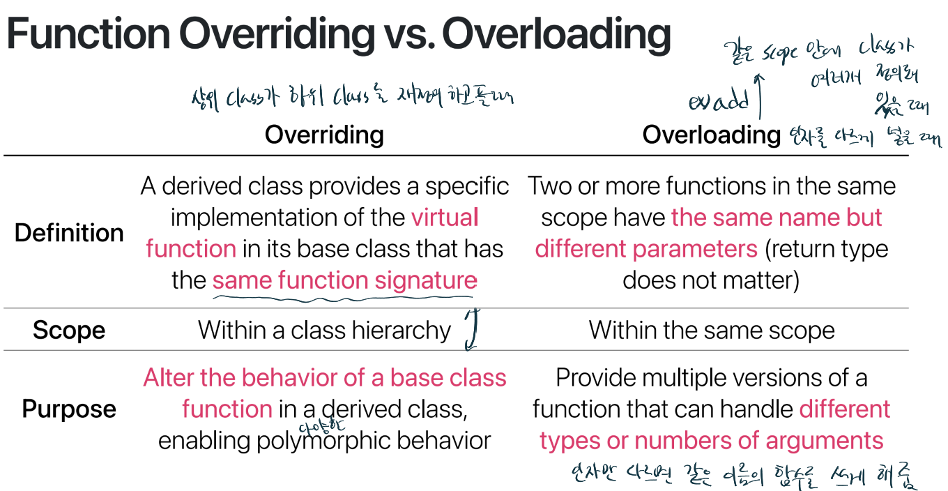 Destructor의 경우에도 virtual <-> Override를 쓰기도 하는데, 이유는 Class Pointer로 자식 class Object를 만들어 준 뒤에 delete 하면, 이전과 달리 부모 class destructor 기준으로 삭제가 실행되기 때문이다. 이를 막기 위해선 destructor에도 virtual 작업이 필요하다.