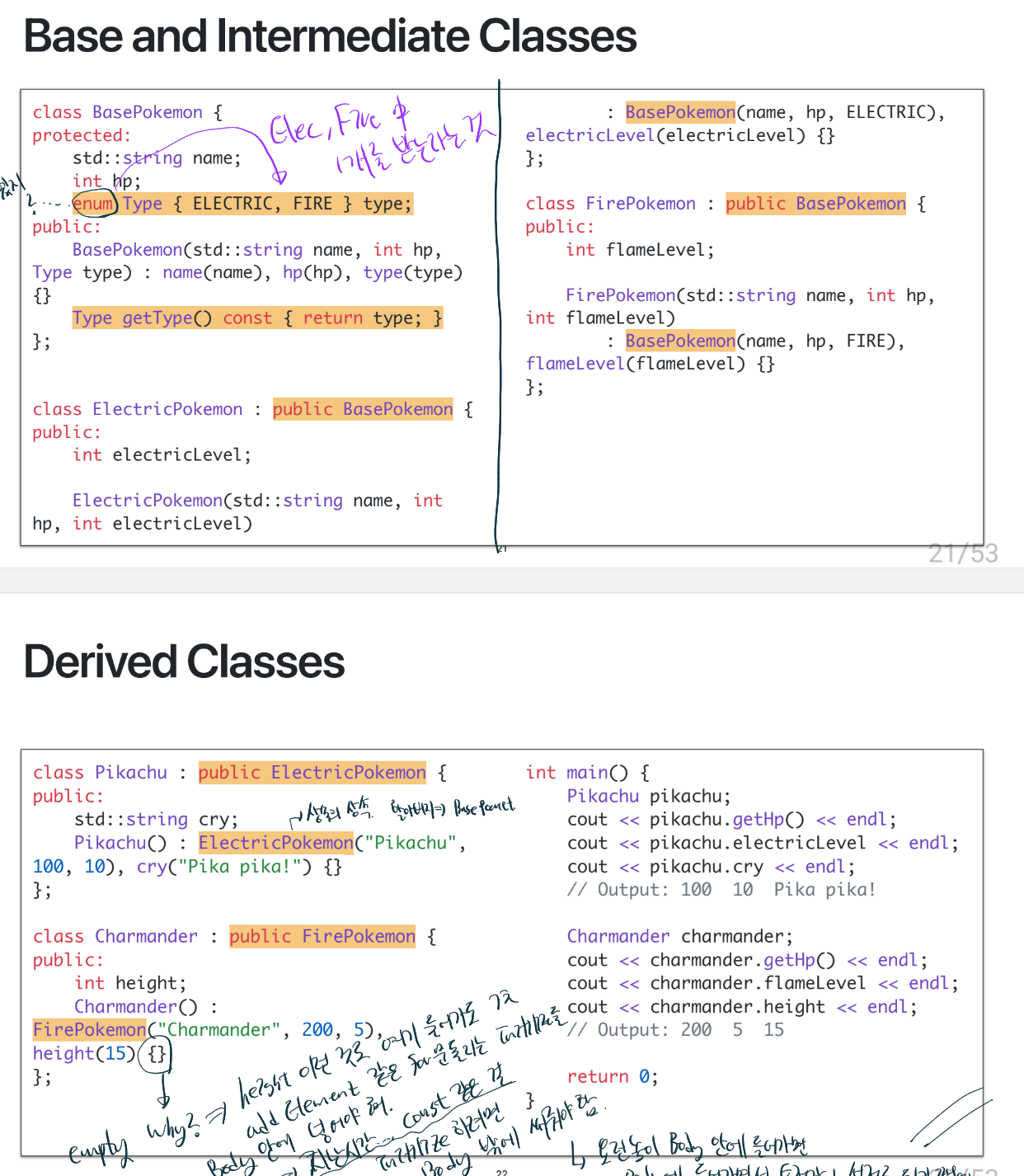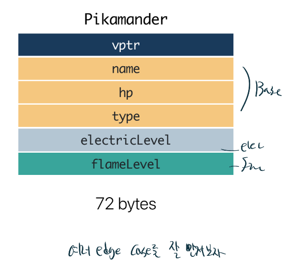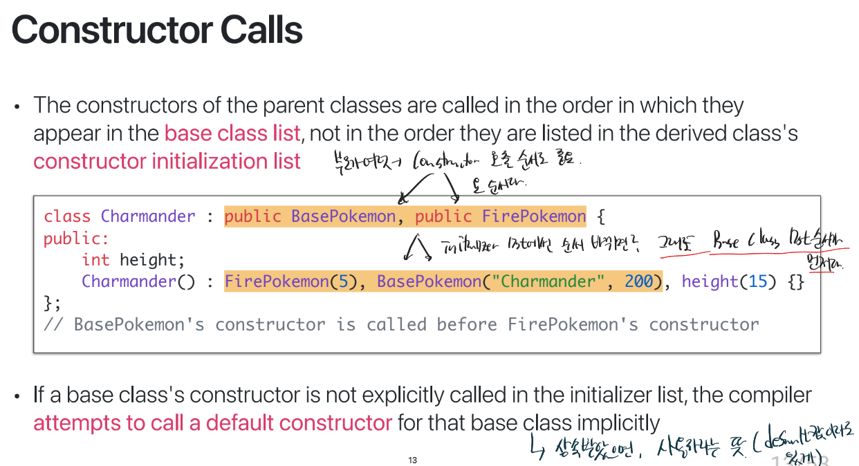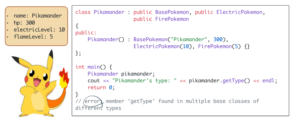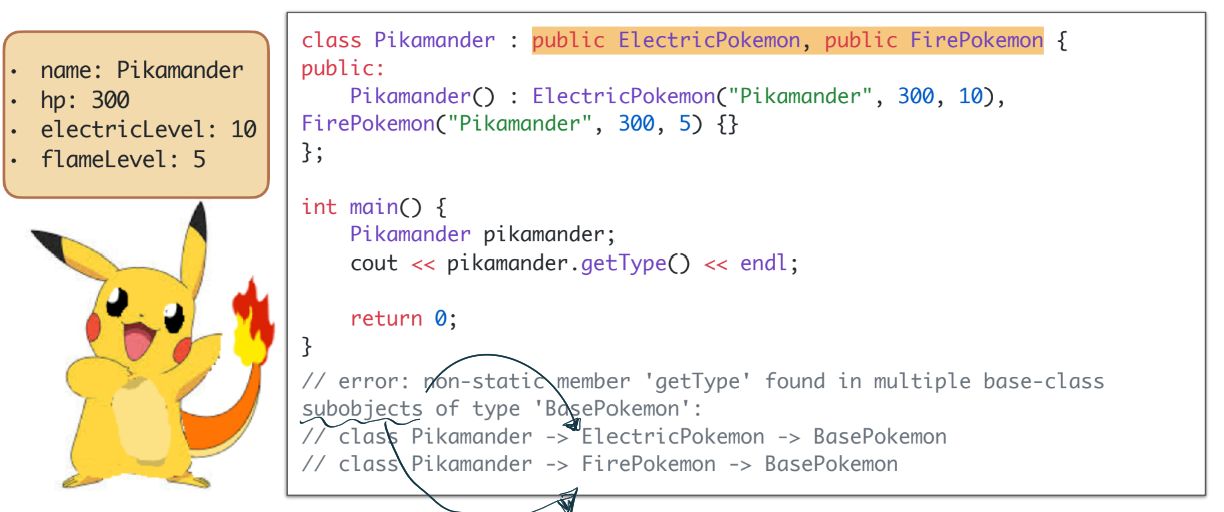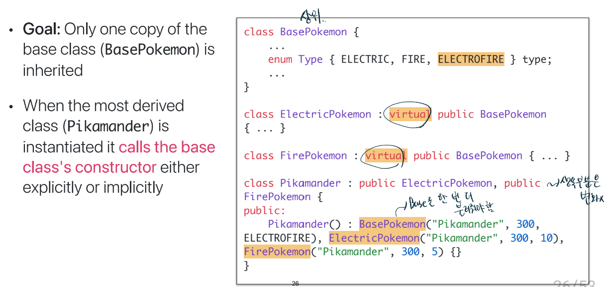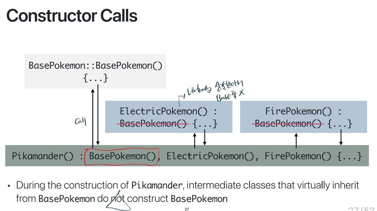 이렇게 부모 class로부터 상속받을 때 virtual을 써주면 손자 class(Pikamander() ) 에서 constructor call이 들어오면 제일 최상위 BasePokemon class를 한 번 부르게 된다. 대신에 Pikamander constructor에 BasePokemon을 추가해줘야 하는 번거로움은 있다.