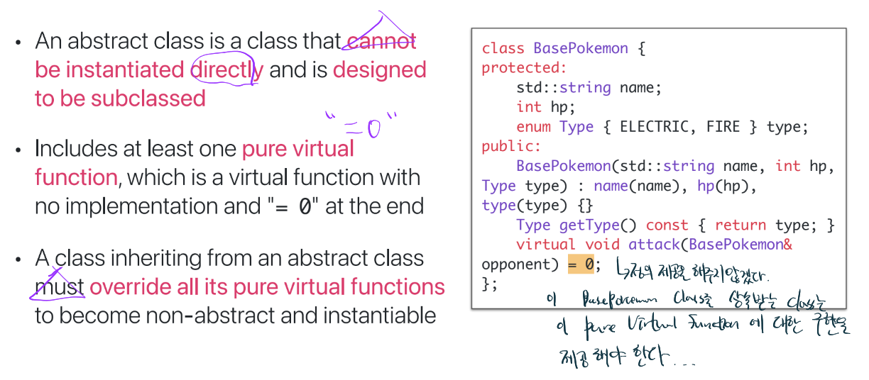 딴 거 없고 단 한개라도 Pure virtual function( " = 0 " 으로 표현)을 갖고 있으면 된다. 얘는 얘를 직접적으로 통해서 Object를 만들 수 없으며, 이 놈을 상속받은 Class 무조건 이 Pure virtual function에 대한 정의를 해야 한다.