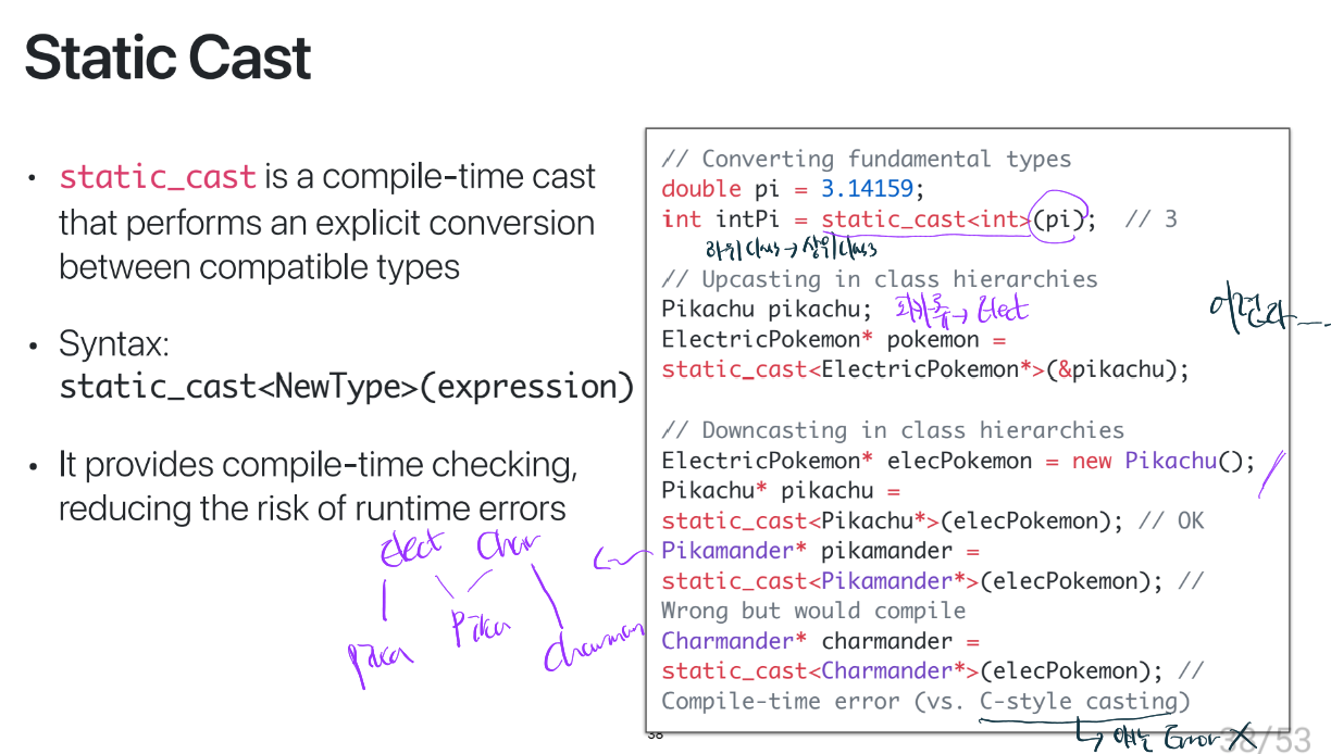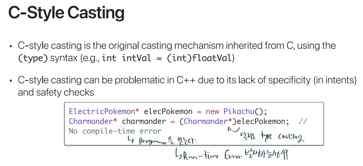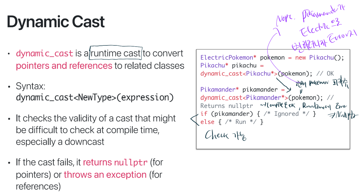 하지만 Dynamic Cast는 Vptr, Vtable 사용이 많아서 비싼 작업이라 굳이 사용하진 않는다.