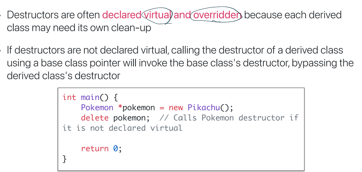 이와 유사하게 Destrcutor도 상속되지 않아서 자식 class에서 이것도 따로 선언해줘야 한다.