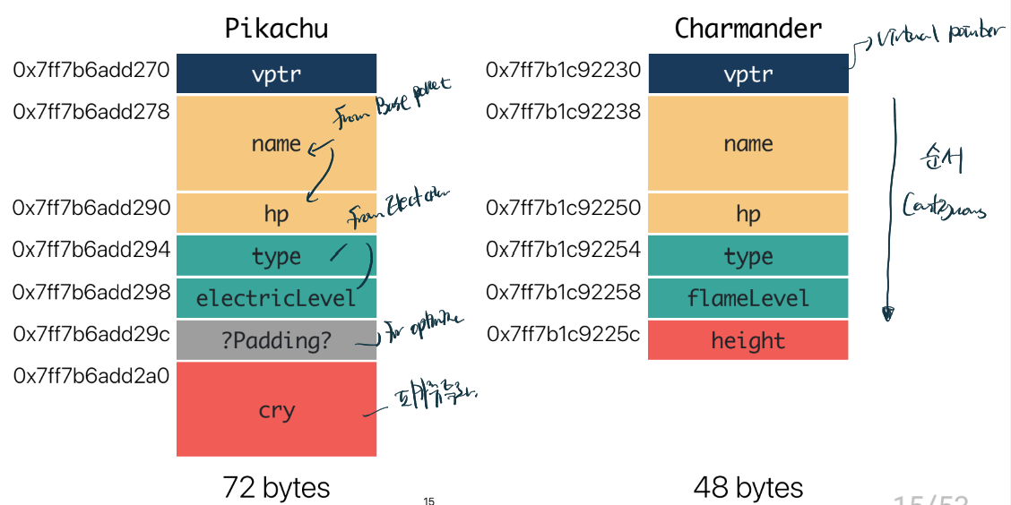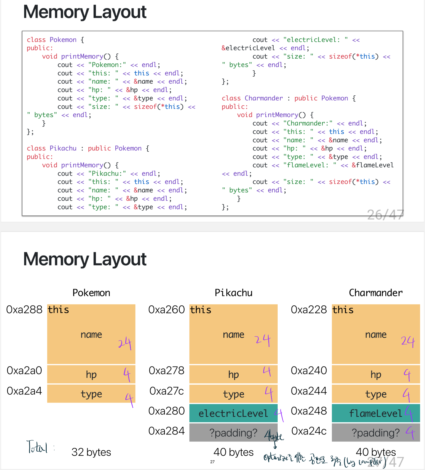 그리고 Derived Class의 경우 Padding 이라는 4byte 크기의 여유공간이 있는데, 밑에 다룰 #virtualPointer 를 위한 공간이라고 한다.