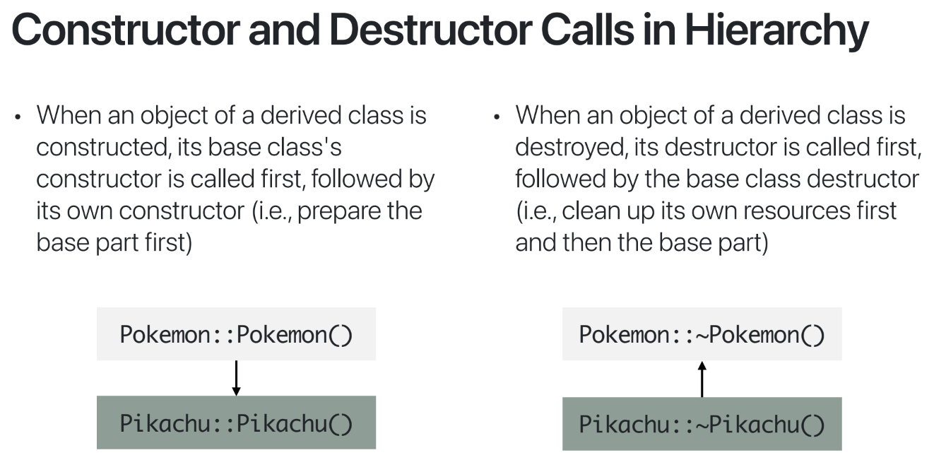 반면에, Destructor의 경우 Constructor call과 반대순서로 실행된다. 위 예시에선, Charmander -> Fire -> BasePokemon 순서로!