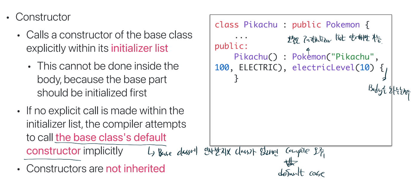 자식 class에서 부모 class의 Constructor를 call 할 때는, body부분이 아니고 initializer list 부분에 명시적으로 써야하며 이게 없으면 부모 class constructor의 default case를 가져다가 초기화에 쓴다.