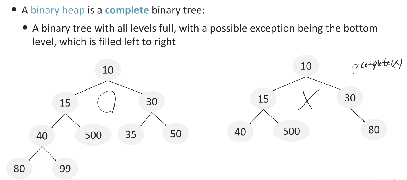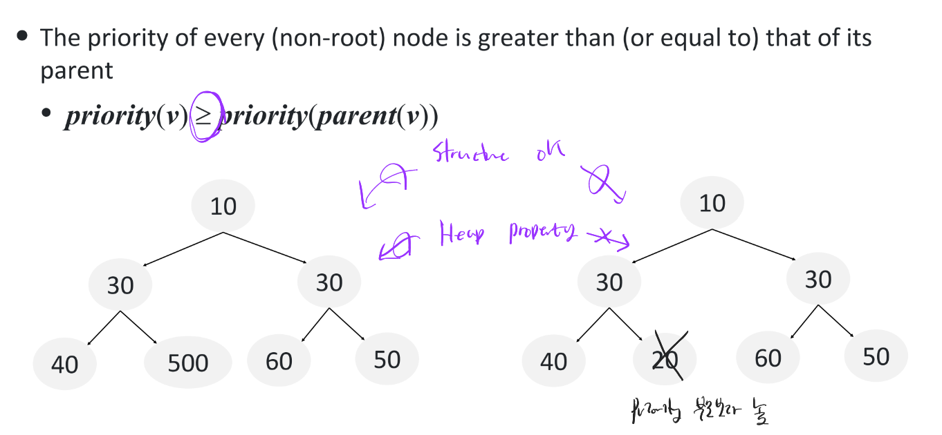 즉 Heap(정확히는 Binary Min heap)의 경우엔 구조는 Complete Binary Tree이고 모든 부모는 자식보다 크기가 작아야 한다는 Heap Property를 만족해야 한다.