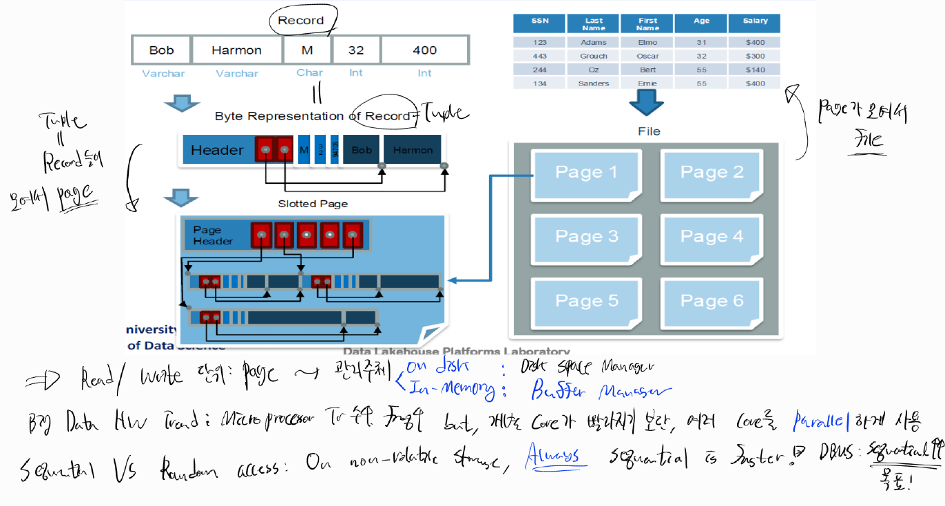Database Storage[3] DB의 Storage 부분을 공부해보자..! 이 목차의 목적은 How to build Software that manages a DB를 하는 것이다. DB의 객체가 되는 Data의 기본적인 Form은 아래와 같다. 각 Record( = Tuple ) 들은 Header를 통해 indirect하게 Page 내부 Slot에 연결되어 있다. 그리고 그 Page들이 모여서 File을 이룬다. Data Science/SQL & Database Management System 2025.02.09